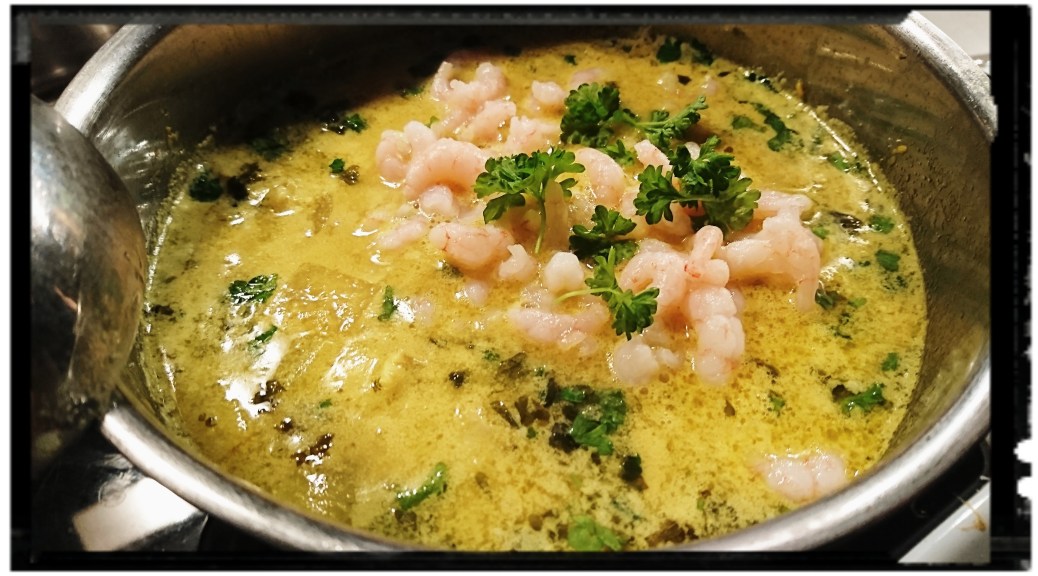 - Låt puttra i ca 10 minuter, tills fisken är klar. Tillsätt räkorna, den hackade persiljan och smaka av med salt. Servera.